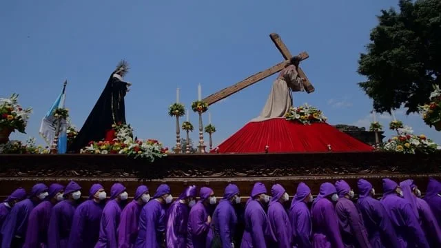 In Antigua, Guatemala, numerous processions organized and executed by Brotherhoods (Escuela de Cristo, Merced, San Francisco, etc.) fill Holy Week with a ritual that is both spectacular and deeply moving. It is the largest such massive display of faith in the New World, established in the time of the Spanish Conquest.
